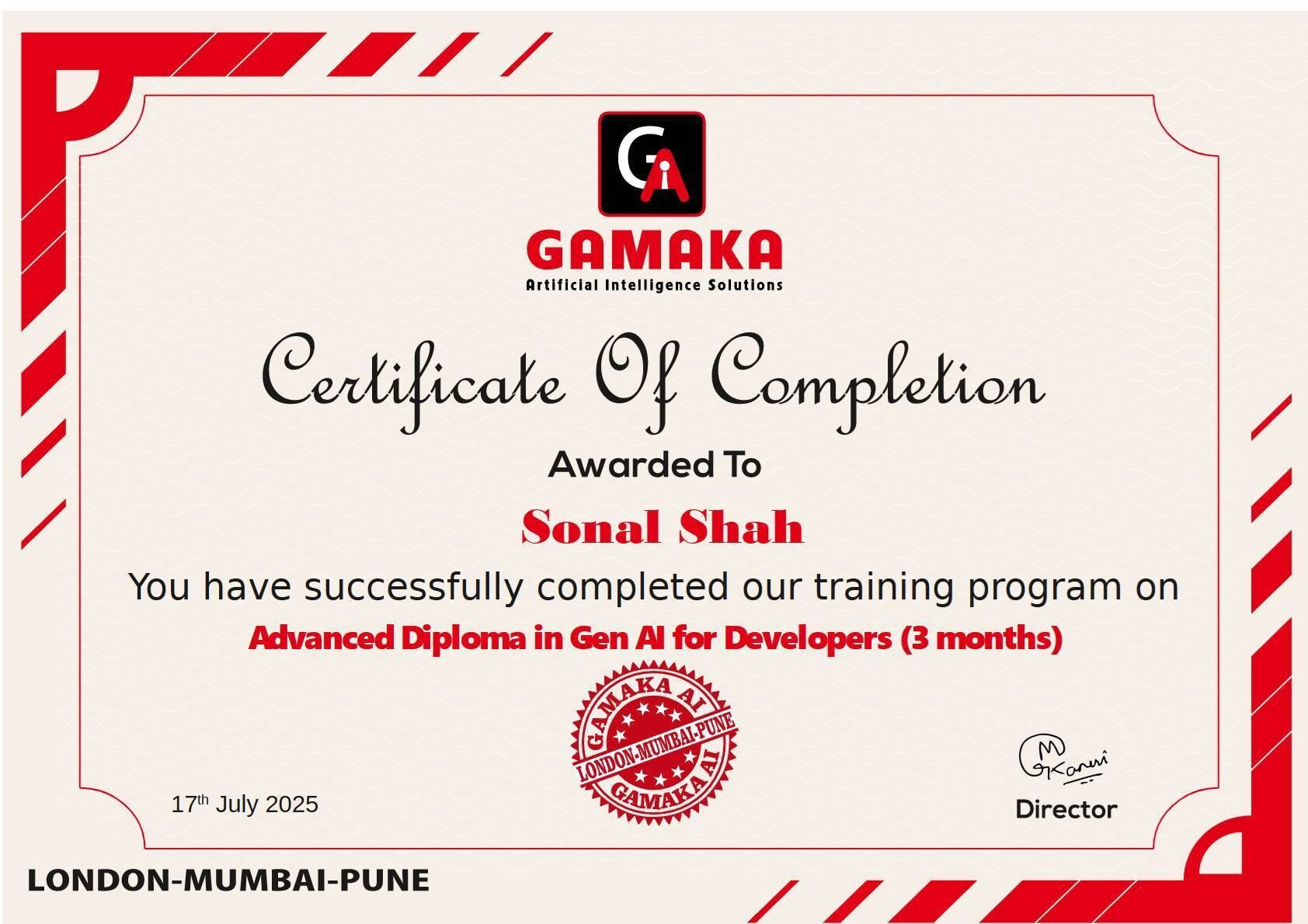 I am currently enrolled in the Data Science course at Gamaka AI Institute, Pune (Kothrud branch). I have successfully completed the Python module (Basic to Advanced), which covered key topics such as Python fundamentals, data structures, functions, object-oriented programming (OOP), file handling, and essential libraries including NumPy, Pandas, and Matplotlib. The module included hands-on practice, assignments, and mini-projects, providing a strong foundation for further learning in Data Science and Machine Learning