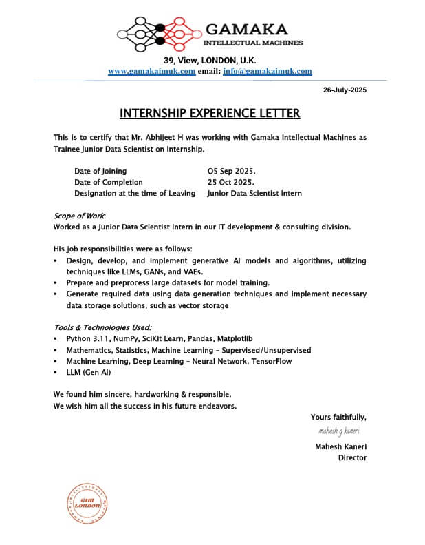 The Python course at Gamaka AI was a great learning experience. The curriculum was well-structured, covering everything from basic syntax to advanced concepts like data structures and OOP. The hands-on approach and real-world applications made learning engaging. The instructors were knowledgeable and provided clear explanations. Good staff and Excellent teaching , Communication is good also Placement is good.